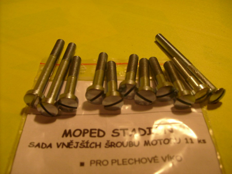 Sada přesných pohledových šroubů motoru S 11 s měkkým plechovým víkem zapalování. Na obě strany motoru, včetně viditelných šroubů poloviny motoru, přesně podle originálu. Pozinkované. V ceně je i šroub na kontrolu hladiny oleje.